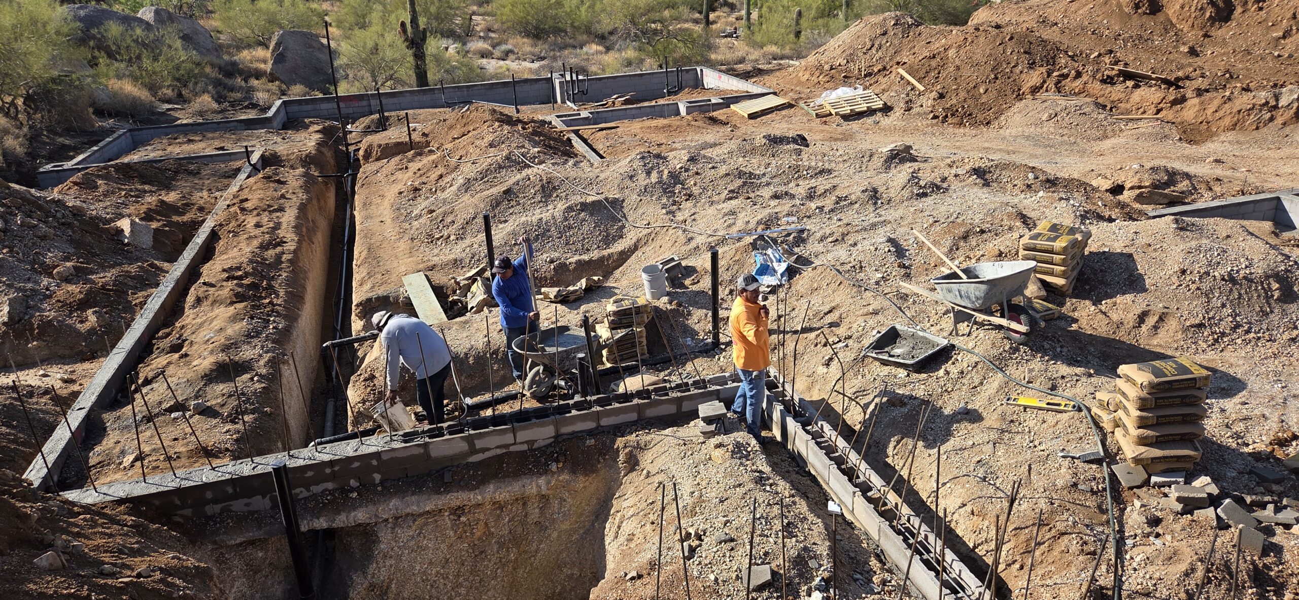 Footing stem walls being built. Once steel has been place they can be inspected and then grouted prior to slab pour.